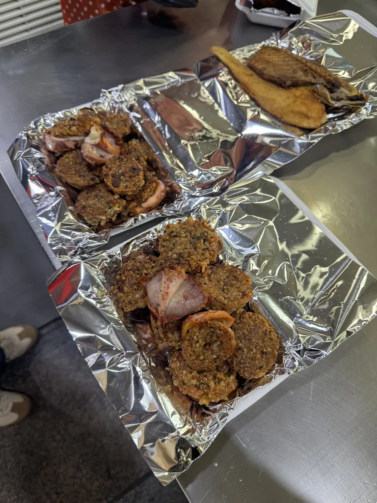 드디어 마주한 누룽지 오징어순대! 비주얼부터 압도적입니다. 일반적인 계란물 입힌 오징어순대와는 달리, 기름에 바삭하게 튀기듯 구워내 겉면이 정말 누룽지처럼 바삭바삭해요. 한 입 베어 물면 '파삭!'하는 소리와 함께 고소함이 입안 가득 퍼집니다. 속은 쫄깃한 오징어와 담백한 소로 채워져 있어 겉바속촉의 정석을 보여주죠.